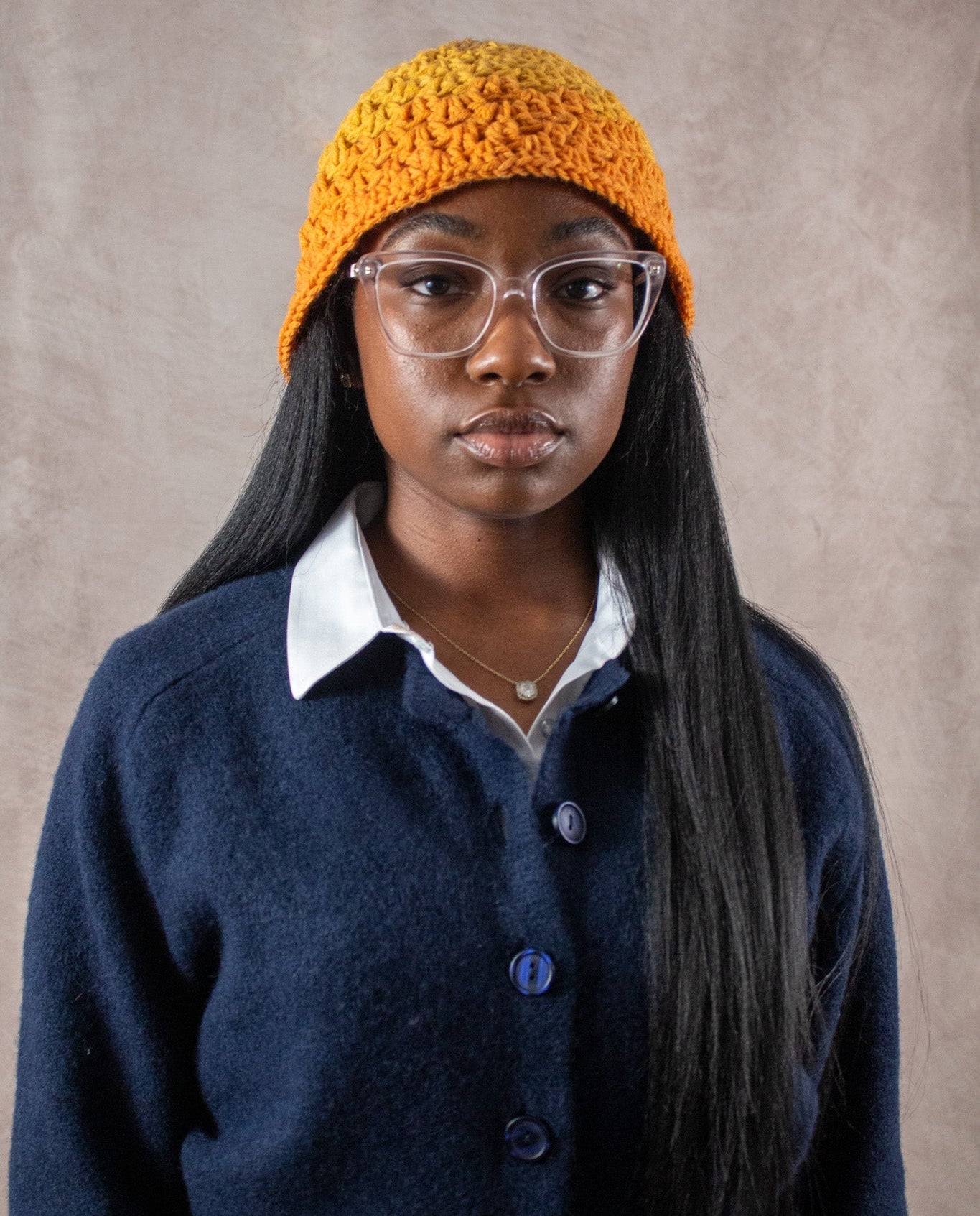 Crocheted by hand with soft yarn in warm shades of gold and orange.